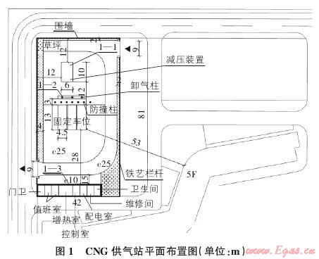2) 總平面布置。根據(jù) GB 50028-2006 第7.3.11的要求,CNG供氣站本站總平面應(yīng)分區(qū)布置,本工程站區(qū)分為生產(chǎn)區(qū)和生產(chǎn)輔助區(qū)。生產(chǎn)區(qū)由工藝裝置區(qū)、卸氣柱、壓縮煤層氣撬車區(qū)組成,壓縮煤層氣撬車固定車位最大儲氣總?cè)莘e為8000m3,撬車固定車位四周有足夠的回車場地,生產(chǎn)區(qū)布置在站區(qū)以北。生產(chǎn)輔助區(qū)主要出入口布置于場區(qū)西南側(cè),并在場區(qū)形成環(huán)形消防通道,場區(qū)中間設(shè)置固定車位3個,設(shè)置3個卸氣柱,減壓裝置和調(diào)壓裝置位于場區(qū)北側(cè)。新建建筑物有: 值班室、控制室、變配電室、增熱室、維修間、門衛(wèi)、衛(wèi)生間等,布置在場區(qū)南側(cè)。場區(qū)四周設(shè)置高度2m的圍墻及車輛出、入口。出、入口道路與站外規(guī)劃路銜接,滿足人流疏散及車輛安全行駛。平面布置如圖 1 所示。