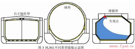 隨著 LNG 貨輪技術(shù)的不斷進步,最近幾年提出的 FLNG 概念設(shè)計均采用鋼質(zhì)船體,配以不同形式的LNG 儲艙(圖2)。如 Shell 公司投資建造了一艘巨型 FLNG,采用雙殼式船身,SPB 型儲艙,長488m,寬74m;空載質(zhì)量達26×104t,相當(dāng)于6艘航空母艦,滿載質(zhì)量達60×104t。該 FLNG 投資估計超過30×108美元,每年至少生產(chǎn)530×104t 液態(tài)產(chǎn)品,包括360×104t LNG、130×104t 凝析油和40×104t LPG。