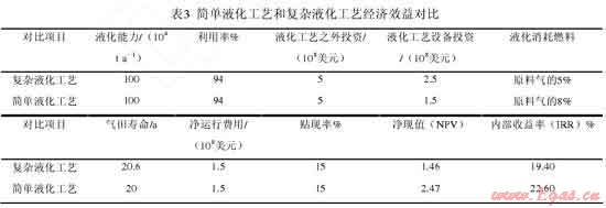 David Franklin等[4]對 FLNG 采用簡單液化工藝和復(fù)雜液化工藝的經(jīng)濟效益進行比較,發(fā)現(xiàn)采用簡單液化工藝效益更好(表3),液化能力同為100×104t·a-1的浮式天然氣液化裝置項目,采用簡單液化工藝的凈現(xiàn)值是采用復(fù)雜液化工藝凈現(xiàn)值的1.69倍,內(nèi)部收益率高出3.2%??梢?,與陸上 LNG工廠不同,FLNG 對初始投資更敏感。簡單液化工藝具有占用甲板面積小、設(shè)備少、檢修時間短、可在有限甲板空間上獲得較高產(chǎn)量等優(yōu)點,更適用于 FLNG。
