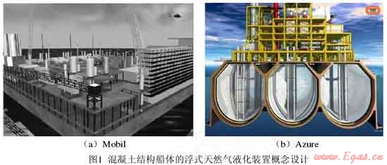 最初,FLNG 概念設(shè)計采用混凝土制造船體,在其上放置球形、圓柱形或薄膜型 LNG 儲艙?;炷翚んw吃水深,承載能力大,具有低溫性能好、不易老化的優(yōu)點,但是這種結(jié)構(gòu)的船身笨重,遷移和錨泊將是巨大的挑戰(zhàn)。代表性的 FLNG 概念設(shè)計有:Mobil 公司的 Floating LNG 和 Bouygues Offshore 公司的 Azure項目(圖1)。