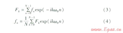 工程測試信號總是以離散形式出現(xiàn),為此需對連續(xù)信號的傅里葉變換進行改進。把離散非周期信號(N點長的序列)延拓成周期信號后,取傅里葉級數(shù)的主值區(qū)間得到離散傅里葉變換。具體處理方法為:將0→t的時間區(qū)間等間距劃分為N個子區(qū)間,每個子區(qū)間的寬度為Δt=T/N(T為時間區(qū)間長度),用下標n表示離散值的采樣時刻,fn為函數(shù)f(t)在tn處的值,則離散傅里葉變換及其逆變換可表示為:
