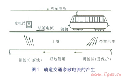 城市軌道交通一般包括城市地鐵、輕軌列車、有軌電車等,多采用直流l 500/750 V驅(qū)動,走行軌回流,系統(tǒng)供電回路與雜散電流的產(chǎn)生見圖l。變電站將交流電變換為直流電,經(jīng)接觸網(wǎng)向機車供電,電流由鋼軌及與之相連的導線返回變電站。由于鋼軌具有一定的電阻,電流在鋼軌中產(chǎn)生電位差,同時鋼軌對地也存在電位差,軌道不可能完全對地絕緣,使得鋼軌中部分電流泄漏進入大地形成雜散電流。泄漏到大地的雜散電流流入地下構筑物、埋地燃氣管道等埋地金屬結(jié)構,經(jīng)埋地金屬結(jié)構流至變電站負極附近通過土壤重新流入鋼軌,在電流流出的部位金屬發(fā)生腐蝕[5]。
