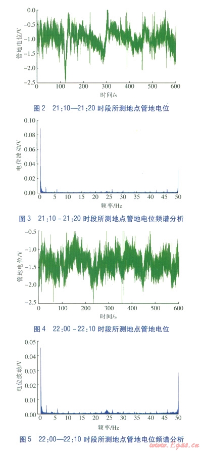 由于測試數(shù)據(jù)量巨大,選取軌道交通不同運行狀態(tài)下各l0 min左右數(shù)據(jù)進行分析,時間段為21:10-21:20、22:00-22:10、00:00--00:10,分別對應軌道交通正常運行、軌道交通單列運行、軌道交通停運后。圖2~7為各時段管地電位波動變化及對應的頻譜分布圖。