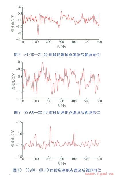 由各時段管地電位變化可得,軌道交通運行期間管地電位存在很大波動,圖2為軌道交通正常運行期間機車通過測試點時管地電位變化,電位波動有明顯峰值,極大值與極小值分別為0 V、-2.5 V; 圖4為單列運行期間無機車通過測試點時管地電位變化,由于其他位置通過機車電流的影響,管地電位仍有明顯波動,但幅值較機車通過時刻有所減??;圖6中軌道交通停運后,管地電位波動明顯減小,但高頻采集數(shù)據(jù)中存在干擾信號,數(shù)據(jù)頻繁對稱波動,需要進行濾波處理。所測結(jié)果表明所測地段燃氣管道受到雜散電流干擾,且雜散電流的產(chǎn)生與軌道交通運行有直接關系。