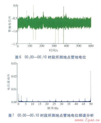 軌道交通運行期間管地電位存在很大波動,機車通過時段管地電位波動高于無機車通過時刻,軌道交通停運后,管地電位波動趨于平緩。21:10-21:20期間有兩列機車通過測試地點,管地電位波動有兩個明顯峰值,受其他位置通過機車電流的影響,管地電位仍有波動,正負偏差交替出現(xiàn)。