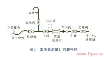 對(duì)于在卸氣柱上增加質(zhì)量流量計(jì)的工藝。是從CNG加氣機(jī)的工藝流程借鑒過(guò)來(lái)的,還應(yīng)該在流量計(jì)之前增加壓力表,為卸氣柱增加一個(gè)箱體,另外,拉斷閥、單向閥(此處的單向閥還有防止管道氣逆流時(shí),保護(hù)質(zhì)量流量計(jì)的作用)必須加裝。帶質(zhì)量流量計(jì)的卸氣柱見(jiàn)圖6。