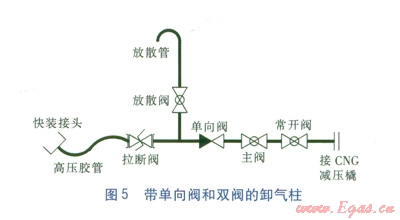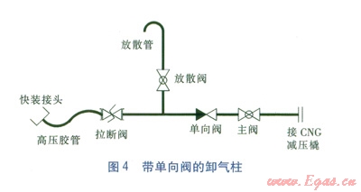 ①用CNG減壓橇來(lái)臨時(shí)供氣,或是不連續(xù)供氣(由于維修等原因可以臨時(shí)停止供氣的情況)時(shí),帶單向閥的卸氣柱工藝是較為合理的,不僅簡(jiǎn)單,也達(dá)到了較高的安全性。