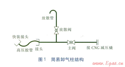 簡(jiǎn)易卸氣柱由連接CNG氣瓶車(chē)的快裝接頭、高壓膠管、主閥、放散閥、連接管道組成。簡(jiǎn)易卸氣柱結(jié)構(gòu)見(jiàn)圖l。