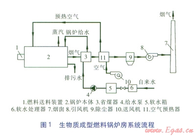生物質(zhì)成型燃料鍋爐房系統(tǒng)流程見(jiàn)圖l。鍋爐房由鍋爐本體、燃料送料裝置、送引風(fēng)機(jī)、軟水處理器、除塵器等組成。鍋爐房的燃料(生物質(zhì)成型燃料)、水、煙氣、空氣的流程與常規(guī)燃煤鏈條爐排鍋爐房近似。