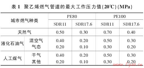1.2.2 在聚乙烯燃?xì)夤艿赖膲毫υO(shè)計(jì)中,還需要考慮到燃?xì)庵兴姆枷銦N類物質(zhì)所產(chǎn)生的影響,以及管道的施工條件等因素,根據(jù)國家相關(guān)的行業(yè)標(biāo)準(zhǔn),聚乙烯燃?xì)夤艿涝试S的最大工作壓力如表1。