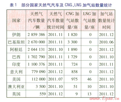 由表l可以看出,伊朗、巴基斯坦、阿根廷、巴西、印度和意大利等幾個(gè)國家的天然氣汽車擁有量接近世界天然氣汽車總量的80%,且全部采用CNG汽車。通過表l中CNG加氣站與LNG加氣站數(shù)量對比,可以判斷,世界范圍內(nèi)LNG汽車數(shù)量遠(yuǎn)遠(yuǎn)小于CNG汽車數(shù)量,車用LNG處于起步階段。
