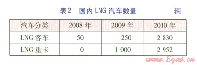 截至2010年,國內(nèi)有近6 000輛LNG汽車,推廣使用LNG汽車的城市主要有北京、貴陽、長沙、烏魯木齊等,均以LNG公交車為主。表2為近幾年來我國LNG汽車的發(fā)展情況[6]。