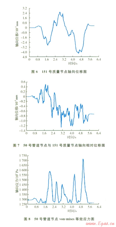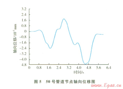 圖8顯示了管道50號節(jié)點von-mises等效應力在整個爆破地震波作用周期內(nèi)的變化趨勢,在第4.8 s時管道中間節(jié)點應力達到170 MPa,仍然處于彈性階段。由于描述地震破壞作用的主要參數(shù)是軸向應變,而此算例的軸向應變最大值為0.0011,與采用抗震規(guī)范法中計算出的最大軸向應變?yōu)?span lang="EN-US">0.001 3極為接近,也證明了模擬結(jié)果的準確性。