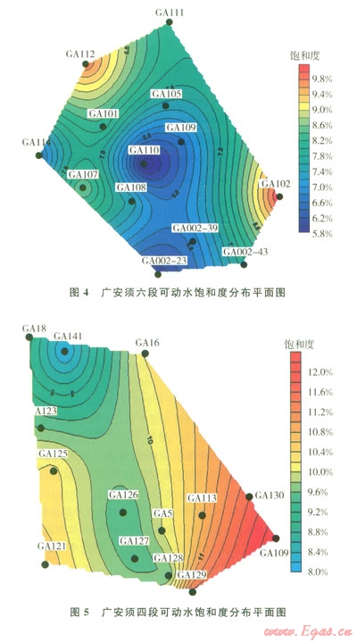 繪制了廣安氣田兩個(gè)主力區(qū)塊須家河組儲(chǔ)層可動(dòng)水飽和度平面分布圖,包括廣安2井區(qū)須六段120 km2和廣安106井區(qū)須四段400 km2儲(chǔ)層。