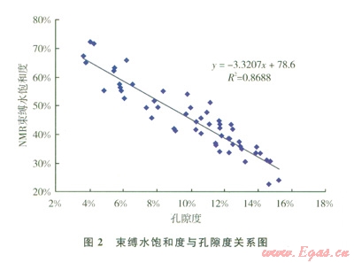 常規(guī)測(cè)井解釋可動(dòng)水飽和度的原理如下:根據(jù)核磁共振技術(shù)標(biāo)定巖樣束縛水飽和度(原始含水飽和度減去可動(dòng)水飽和度)與孔隙度之間的關(guān)系(2);②在各個(gè)深度點(diǎn),根據(jù)常規(guī)測(cè)井解釋出的孔隙度計(jì)算出束縛水飽和度;③將常規(guī)測(cè)井解釋出的原始含水飽和度減去束縛水飽和度,得到該深度儲(chǔ)層的可動(dòng)水飽和度,從而繪制出可動(dòng)水飽和度縱向分布曲線。