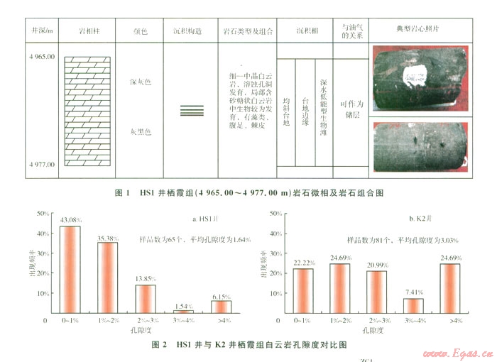 測(cè)井電性特征是巖石本身以及巖石內(nèi)部流體等綜合反映的結(jié)果,這也是進(jìn)行測(cè)井解釋儲(chǔ)層及其含流體情況的基礎(chǔ)。儲(chǔ)層的儲(chǔ)集性能主要受沉積環(huán)境、成巖作用的影響。依據(jù)前人的研究成果,結(jié)合野外地質(zhì)觀察發(fā)現(xiàn),川西地區(qū)棲霞組儲(chǔ)層主要為生物灘,古生物化石從破碎到完整均有,不具抗浪格架,平面上由于位置不同,沉積環(huán)境的不同,其結(jié)構(gòu)組分和后期成巖作用也有著明顯的差異。根據(jù)川西地區(qū)棲霞組巖心觀察和野外露頭結(jié)果認(rèn)為,川西南部地區(qū)棲霞組巖性主要為水體能量較低的泥品灰?guī)r夾細(xì)-中晶白云巖化灰?guī)r。從巖心觀察看,HS1井棲霞組取心段巖性主要為深灰-灰黑色白云巖,局部發(fā)育中晶白云巖(圖1)。根據(jù)65個(gè)柄霞組巖心樣品物性分析表明,HS1井孔隙度分布范圍較大,介于0.1 6%~l0.39%,主要孔隙度集中在0~2%之間,平均孔隙度僅為l.64%,明顯低于川西北部地區(qū)K2井棲霞組巖心的平均孔隙度(3.03%),滲透率極低,一般均小于0.008 mD(圖2)。儲(chǔ)層物性特征表明,川西南部地區(qū)棲霞組儲(chǔ)層具有低孔隙度、低滲透率致密碳酸鹽巖儲(chǔ)層的特征,雖然儲(chǔ)層中局部存在高孔隙度、高滲透率段,但總體看來(lái)儲(chǔ)層儲(chǔ)集性能差,根據(jù)四川盆地碳酸鹽巖儲(chǔ)層劃分標(biāo)準(zhǔn)來(lái)看應(yīng)屬于差儲(chǔ)層-非儲(chǔ)層。