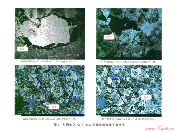 儲(chǔ)層瀝青的存在不僅改變了儲(chǔ)層孔隙結(jié)構(gòu),導(dǎo)致儲(chǔ)層巖電參數(shù)變化,而且還會(huì)導(dǎo)致物性、含油性和電性的變化。當(dāng)有瀝青充填到儲(chǔ)層的孔隙中時(shí),由于瀝青的導(dǎo)電性差或不導(dǎo)電性將導(dǎo)致儲(chǔ)層電阻率較未含瀝青層段電阻率高,從而在測(cè)井曲線上表現(xiàn)出高電阻率的電性特征。HS1井和K2井在鏡下薄片中均可以見(jiàn)到瀝青不同程度的充填,其主要充填于儲(chǔ)集層的孔隙或裂縫中,從瀝青的產(chǎn)狀看,瀝青主要充填于晶間和晶間溶蝕溶孔的內(nèi)壁(圖4)。從測(cè)井曲線看,當(dāng)瀝青出現(xiàn)在有瀝青充填的儲(chǔ)層井段時(shí),該段電阻率值明顯較同一巖性井段的要高。