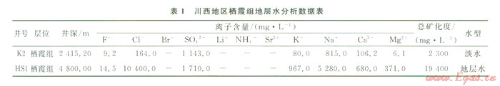 按導(dǎo)電機(jī)理的不同,巖石可分成兩大類,離子導(dǎo)電的巖石和電子導(dǎo)電的巖石,前者主要靠連通孔隙中所含的溶液的正負(fù)離子導(dǎo)電;后者靠組成巖石顆粒本身的自由電子導(dǎo)電。高阻水層的形成主要受宏觀地質(zhì)背景、微觀孔隙結(jié)構(gòu)、孔隙充填物以及流體性質(zhì)等因素的影響。從電性特征看,川西南部的漢深l井與川西北部的礦2井電阻率都較高,根據(jù)該區(qū)岡版解釋儲(chǔ)層流體具有典型的氣層特征,但測(cè)試結(jié)果卻與測(cè)井解釋存在著較大差異,兩口井均產(chǎn)水。從其水化學(xué)分析結(jié)果看,兩者水的性質(zhì)也存在較大差異,從K2井水分析資料來(lái)看:Cl-含量?jī)Hl 64 mg/L,反映地層水為低礦化度的NaHC03型淡水,而HS1井則為高礦化度的CaCl2型地層水(表1)。雖然兩者都產(chǎn)水,但是由于其水的性質(zhì)不同,因而兩者代表著不同的成藏過(guò)程和地質(zhì)意義。下面分別分析高阻水層的成因。