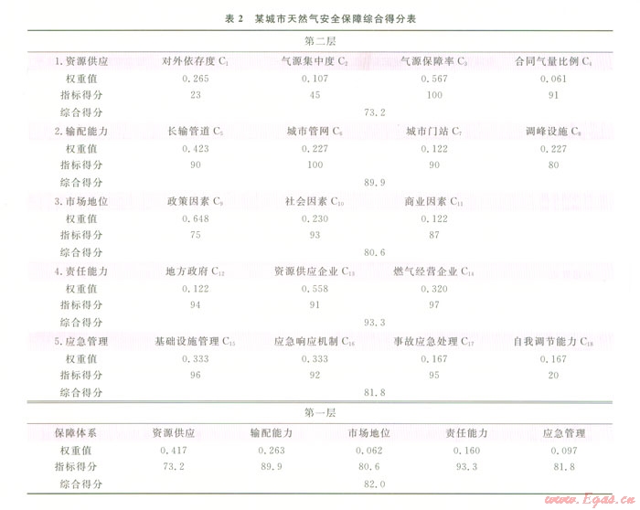 基于上述判斷矩陣,計算某城市的天然氣供應保障模型綜合得分,綜合得分是指各項評價指標得分與權重值的加權求和,得到該城市的綜合得分為82.0分,計算結果見表2。