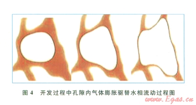 氣藏開發(fā)過程中,隨著儲層壓力逐步下降,壓力降傳導(dǎo)到孔隙內(nèi)的氣體時,氣體體積迅速膨脹,對孔隙表面水相進行擠壓,并對微細孔喉處的水相產(chǎn)生推動力,這種推動力只要大于某一微細孔喉處的毛細管力束縛,則這部分微細孔喉處及其控制的孔隙內(nèi)的殘余水就會被推動,從而運移產(chǎn)出成為可動水(圖4)。另一方面,開發(fā)過程遠遠快于成藏過程,因而開發(fā)過程中驅(qū)替壓力梯度大于成藏過程中的驅(qū)替壓力梯度,故成藏過程中部分末被驅(qū)出的水相可以在開發(fā)過程被驅(qū)替出,成為可動水。對于須家河組氣藏而言,由于微細孔喉發(fā)育,殘余水飽和度較高,衰竭式開發(fā)過程中壓力梯度大,因而可動水產(chǎn)出量較大,嚴重影響氣藏產(chǎn)能。