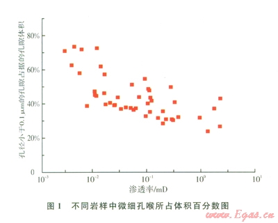 巖樣壓汞測試結(jié)果表明,須家河組低滲儲層孔喉細小,微孔喉發(fā)育。儲層滲透率越低,小于0.1 μm的微喉道控制的孔隙體積比例越高(圖1)。對于覆壓滲透率為0.1 mD左有的儲層,由小于0.1 μm的喉道控制的孔隙體積在30%以上,對滲流能力起主要貢獻作用的是0.5~1μm之間的喉道。覆壓滲透率0.01mD左右的儲層,由小于0.1μm的喉道控制的孔隙體積在45%~75%之間,對滲流能力起主要貢獻作用的是0.1~0.5μm之間的喉道。