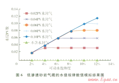 為了進一步研究儲層產(chǎn)水的宏觀機理,開展了兩種氣水狀態(tài)下的物理模擬實驗和數(shù)值計算。一種是氣水分異明顯的儲層,一種是氣水互封狀態(tài)下的儲層再,對比分析水封氣狀態(tài)及氣、水能量對儲層產(chǎn)水的影響規(guī)律。結(jié)果表明,對于氣水分異明顯的低滲儲層,由于水相彈性膨脹能力小,且儲層滲透率低,儲層產(chǎn)水量很小,而且水體倍數(shù)對其影響也很小,對于氣體產(chǎn)能影響不大,可以忽略不計。對于氣水互封的儲層,采氣過程中巖心的水侵量達到了0.2 PV,會嚴重影響氣體產(chǎn)能,可見氣水存在關(guān)系對于氣井產(chǎn)水有重要影響。圖6是不同水封氣量下氣井開發(fā)過程中的水侵動態(tài)數(shù)值計算結(jié)果,發(fā)現(xiàn)水封氣能量越高,儲層越容易產(chǎn)水;隨可動水飽和度增加(對于束縛水飽和度一定的儲層,即原始含水飽和度增加),氣井開發(fā)過程中的水侵量顯著增加,南不含水封氣到0.1 PV水封氣,對應(yīng)的水侵量由0增加到近0.12 PV,嚴重影響氣井產(chǎn)能。由此可見,低滲儲層產(chǎn)水量主要受到兩方面的宏觀因素控制:一是水封氣能量大小,二是可動水飽和度高低。