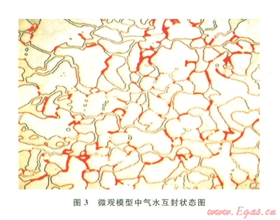 微觀模型含水狀態(tài)下開發(fā)物理模擬實驗表明,對于低滲透砂巖氣藏來講,由于水相一般為潤濕相,主要分布在微細孔喉內(nèi)及巖石表面,氣體賦存在孔隙內(nèi),含水微細孔喉包圍控制孔隙體,形成氣水互封的狀態(tài)(圖3)。開發(fā)過程中,氣相產(chǎn)出要突破孔喉處水相的束縛作用。