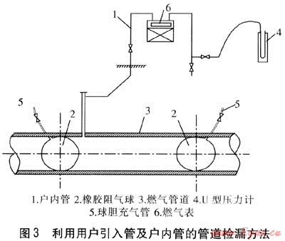 如果兩球之間的管段上連接有用戶(hù),則可利用用戶(hù)引入管進(jìn)行管道檢漏(見(jiàn)圖3),充氣和測(cè)壓可充分利用用戶(hù)引入管及戶(hù)內(nèi)管。