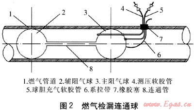 堵球查漏一般都在燃?xì)夤艿纼?nèi)壓力較低,且燃?xì)獠涣鲃?dòng)或流速極小的情況下進(jìn)行。將連通球放置妥當(dāng)后,用球膽充氣軟膠管充入空氣升壓使球膽膨脹,這樣兩球間就形成一個(gè)與兩端隔絕的密閉空間。再用測(cè)壓軟膠管向此密閉空間充氣(以氮?dú)獾榷栊詺怏w為宜),達(dá)到一定壓力后,停止充氣。在測(cè)壓軟膠管的地面端接U型壓力計(jì)測(cè)壓觀察,如果這段空間的管道壁有破損而泄漏,則壓力會(huì)下降。如此移動(dòng)檢查,即可確定泄漏點(diǎn)位置。在查漏實(shí)踐中,這種方法比較實(shí)用,但還有一些弊端和不方便的地方。