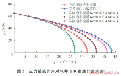 圖2為應(yīng)力敏感作用對(duì)氣井IPR曲線的影響,從圖中可以看到,應(yīng)力敏感作用會(huì)使氣井的產(chǎn)量降低,特別是在井底流壓較低時(shí),產(chǎn)量降低得越嚴(yán)重;對(duì)于滲透率模量計(jì)算的IPR曲線,在相同的井底流壓下,常滲透率模量越大,氣井的產(chǎn)量越低;對(duì)于該氣井用變滲透率模量計(jì)算的IPR曲線與用常滲透率模量計(jì)算的IPR曲線在形態(tài)上具有相似性,但是當(dāng)井底流壓較小時(shí),用變滲透率模量計(jì)算的產(chǎn)量與用常滲透率模量計(jì)算的產(chǎn)量差異較大,由于變滲透率模量更能夠反映儲(chǔ)層的滲流特征,因此用傳統(tǒng)的常滲透率模量計(jì)算的產(chǎn)量可能會(huì)錯(cuò)誤估計(jì)應(yīng)力敏感作用對(duì)氣井產(chǎn)量的影響。