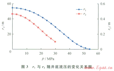 圖3為r1與r2隨井底流壓的變化關(guān)系圖,由于實(shí)驗(yàn)發(fā)現(xiàn)在有效應(yīng)力的變化范圍內(nèi)存在著3段滲透率模量,因此從井眼半徑r3(或rw)到供給半徑r0(或re)之間存在著r2與r1將氣藏在徑向上分為3個(gè)區(qū)域,每個(gè)區(qū)域由于有效應(yīng)力的不同而呈現(xiàn)出不同的滲透率變化規(guī)律,從圖中看到,當(dāng)井底流壓小于30MPa時(shí),r1與r2隨著井底流壓的增大都會(huì)減小,當(dāng)井底流壓大于30MPa且小于56MPa時(shí),由于地層中有效應(yīng)力減小,在徑向上則只存在兩個(gè)區(qū)域,且分界處r1隨著井底流壓的增大會(huì)進(jìn)一步減小,直到當(dāng)井底流壓大于56MPa時(shí),則退化為了常滲透率模量的產(chǎn)能模型。