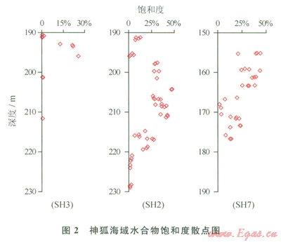 圖2是神狐海域SH3、SH2和SH7站位現(xiàn)場(chǎng)測(cè)試的水合物飽和度散點(diǎn)圖。SH3站位含水合物層較薄,水合物集中分布在192~196m段,最高飽和度值出現(xiàn)在196m處,飽和度值為25.5%,與聲波曲線高值段相對(duì)應(yīng),含水合物層的最高聲速值為205lm/s。SH2站位含水合物層大約有30m厚,水合物集中分布在海底l90~220m,該站位水合物飽和度相對(duì)較高,超過(guò)l5%高飽和度水合物主要集中在197~220m段,飽和度值為15%~47%,平均為29%。該深度段的聲波速度值相對(duì)較高,含水合物層的最高聲速為2279m/s。SH 7站位水合物層大約有22m厚,水合物集中分布在海底l55~177m。與SH2站位相似,該站位水合物飽和度較高,水合物的分布主要分為2段,l55~164m為高飽和度值段,水合物的飽和度為25%~44%,平均為34%,該深度段的聲波速度值整體較高,最高聲速為2578m/s;而l66~177m深度段的水合物飽和度相對(duì)較低,飽和度值為3%~23%,平均為l4%,該深度段的聲波速度值有下降的趨勢(shì),最高聲速為2256m/s。