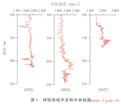 2007年,我國(guó)在神狐海域?qū)嵤┝怂衔镢@探,在SH3、SH2和SH7站位成功鉆獲水合物實(shí)物樣品,筆者利用這3個(gè)站位的聲波測(cè)井曲線來(lái)分析含水合物層的特征。