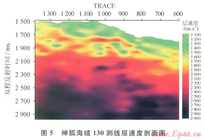 圖5為神狐海域l30測(cè)線用Dix公式計(jì)算的層速度剖面。在距海底大約250ms上方附近(地震剖面上解釋為BSR位置),明顯顯示出一段近似平行于海底的相對(duì)高速層,高速層上、下都是明顯的低速層。高速層的層速度在1800~2500m/s,其上面低速層的層涑度為1500~1700m/s,而下面的低速層的層速度在l100~l500m/s,有明顯的游離氣存在的低速特征,可以認(rèn)為該測(cè)線的相對(duì)高速層速度是水合物層的反映。