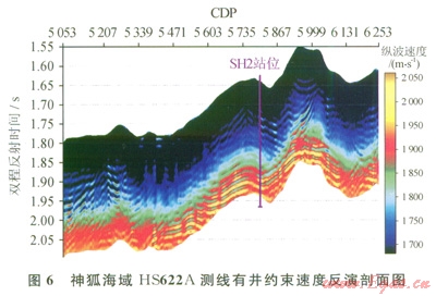 圖6是神狐海域HS622A測(cè)線速度反演剖面。距海底大約200ms的沉積層中有一與海底平行高速帶,厚度約為25m,速度值在2050m/s左右,是沉積層中有水合物存在的體現(xiàn)。高速之下有一速度值約為1800m/s的低速帶,是水合物層之下存在游離氣層的緣故。與層速度剖面相比,有井約束速度反演剖面具有更高的分辨率,能更準(zhǔn)確地判定水合物的富集層位,礦體厚度和游離氣的分布情況,對(duì)水合物的速度精細(xì)解釋起到關(guān)鍵的作用。