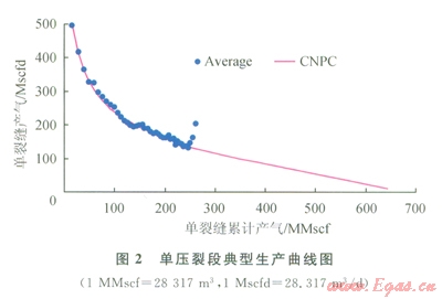 對(duì)于天然裂縫不發(fā)育的低滲、致密砂巖氣藏的氣井,在儲(chǔ)層條件不變的情況下,有效壓裂段數(shù)不同,其產(chǎn)量也不同。在合理的壓裂間距下,氣層長(zhǎng)度越長(zhǎng),氣井的有效壓裂段數(shù)越多,氣井的產(chǎn)量也越高。因此,國際上多采用單壓裂段產(chǎn)能疊加法進(jìn)行水平井產(chǎn)能評(píng)價(jià),西加盈地的Montney組致密氣藏也采用該分析方法來評(píng)價(jià)氣井產(chǎn)能和預(yù)測(cè)氣藏儲(chǔ)量(圖2)。