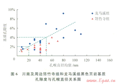 筇竹寺組頁巖樣品孔喉直徑均值一般介于7~105nm,樣品孔喉直徑分布頻率為低于20nm的樣品占9.1%,20~50nm的樣品占69.7%,50~80nm的樣品占12.1%,80~110nm的樣品占9.1%,即直徑小于50nm的中小孔隙占78.8%,直徑大于50nm的大孔隙僅占21.2%。龍馬溪組頁巖孔喉直徑均值一般介于8~160nm,樣品孔喉直徑分布頻率為低于20nm的樣品占5.1%,20~50nm的樣品占51.3%,50~80nm的樣品占l7.9%,80~110nm的樣品占20.5%,大于ll0nm的樣品占5.1%,即直徑小于50nm的中小孔隙占56.4%,直徑大于50nm的大孔隙占43.6%(為筇竹寺組的2倍)。兩套海相頁巖基質(zhì)孔隙度與孔喉直徑均值都具有較好的正相關(guān)性(圖6),孔喉直徑均值為50nm以上、20~50nm和20nm以下的樣品分別具有2.7%~6.9%(平均為4.9%)、0.7%~3.6%(平均為2.1%)和1.0%~l.9%(平均為1.4%)的基質(zhì)孔隙度。這表明,要形成孔隙度在2%以上的有效頁巖儲層,孔喉直徑均值一般需要超過20nm;要形成孔隙度超過4%的優(yōu)質(zhì)頁巖儲層,孔喉直徑均值需達(dá)到50nm以上。可見,在頁巖納米級孔隙系統(tǒng)中,對基質(zhì)孔隙度貢獻(xiàn)最突出的是孔徑超過50nm的大孔隙,其次是孔徑介于20~50nm的中孔,而貢獻(xiàn)最小的是孔徑低于20nm的微小孔(對應(yīng)的孔隙度一般低于2%);筇竹寺組頁巖以孔徑低于50nm的中小型孔隙為主,而孔徑超過50nm的大孔隙明最少于龍馬溪組,這是導(dǎo)致該頁巖基質(zhì)孔隙度明顯減少并低于龍馬溪組的重要原因之一。