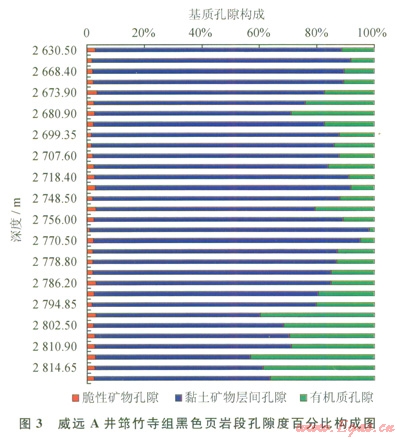 筇竹寺組黑色頁巖基質(zhì)孔隙度為l.4%~3.1%(圖2),約為龍馬溪組富有機質(zhì)頁巖段的1/3~1/2。在基質(zhì)孔隙中,有機質(zhì)孔隙占1.7%~43.2%(平均為18.6%),黏土礦物層間孔隙占53.9%~97.4%(平均為79%),脆性礦物孔隙占0.8%~3.1%(平均為2.4%)(圖3)。在2794~2819m富有機質(zhì)頁巖段,巖性以黑色硅質(zhì)頁巖為主,微含鈣質(zhì),TOC、黏土礦物和脆性礦物3者含量分別為2.4%~3.6%、l4%~27%、72.8%~85.7%,計算的總孔隙度為l.4%~2.0%,其中有機質(zhì)孔隙占20%~43%(平均為34%),黏土礦物層間孔隙占53.9%~77.8%,脆性礦物孔隙僅占l.9%~3.1%(圖3)。
