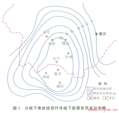 本文以川南筇竹寺組A井、B井兩口鉆井資料為基礎(chǔ)(圖1),借鑒龍馬溪組頁巖儲集空間定量表征的方法和思路[11],應(yīng)用地質(zhì)統(tǒng)計分析法、高精度電子顯微鏡、地球物理測井等技術(shù),依據(jù)頁巖巖礦、地化、物性等實驗測試數(shù)據(jù),對筇竹寺組黑色頁巖(TOC>1%,下同)基質(zhì)孔隙度構(gòu)成和裂縫發(fā)育狀況進(jìn)行了定量分析和評價,并通過與龍馬溪組頁巖納米級孔隙系統(tǒng)的對比分析,對筇竹寺組頁巖基質(zhì)孔隙度的影響因素進(jìn)行了探索研究,以期為深化頁巖氣富集機理研究提供地質(zhì)依據(jù)。