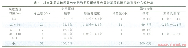 高壓壓汞法是近幾年發(fā)展起來的針對致密性儲層微觀孔隙結(jié)構(gòu)定量表征的有效測試技術(shù),可以測得直徑在幾個納米以上的頁巖孔喉大小和基質(zhì)孔隙度[31]。筆者應(yīng)用該壓汞法(實驗中最高驅(qū)替壓力為200MPa,識別孔喉最小半徑為3.675nm)對川南及其周邊72個頁巖樣品(其中筇竹寺組33個、龍馬溪組39個)開展了孔徑和孔隙度測試,并建立了測試樣品孔徑大小與基質(zhì)孔隙度的相關(guān)關(guān)系,結(jié)果如表4和圖6所示。