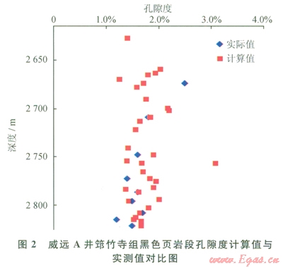 根據(jù)VBri、VClay、VTOC的計算結(jié)果,結(jié)合巖石礦物測試數(shù)據(jù),筆者對威遠(yuǎn)A井2630~2819m頁巖段的32個深度點(對應(yīng)的TOC為0.5%~3.6%)進(jìn)行了孔隙度測算,并將計算孔隙度與該深度段的實測孔隙度進(jìn)行對比(圖2)。對比結(jié)果表明,上述32個深度點的計算孔隙度與該井段實測孔隙度吻合,從而證實所選擇的3個刻度點以及VBri、VClay、VTOC計算值符合筇竹寺組頁巖儲集空間的實際地質(zhì)狀況,可以作為分析筇竹寺組孔隙構(gòu)成的有效方法和地質(zhì)依據(jù)。