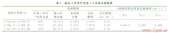 筆者在威遠(yuǎn)A井2796.60~2796.72 m、2788.17~2788.32m和2707.59~2707.68m挑選3個黑色頁巖樣品(對應(yīng)的TOC分別為3.08%、l.73%、1.23%),對孔隙度數(shù)學(xué)模型進(jìn)行刻度(表1)。首先,根據(jù)3個深度點的巖礦、TOC和孔隙度等測試資料和孔隙度計算模型建立三元一次方程組,然后解方程組計算獲得VBri、VClay、VTOC這3個關(guān)鍵參數(shù)值。經(jīng)過計算,筇竹寺組黑色頁巖VBri、VClay、VTOC值分別為0.O002m3/t、0.022m3/t、0.069m3/t(表1)。這表明,筇竹寺組頁巖3種物質(zhì)單位質(zhì)量所產(chǎn)生的孔隙體積為有機質(zhì)最大、黏土礦物次之、脆性礦物最小。