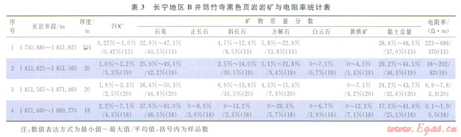 筆者依據(jù)長寧地區(qū)B井筇竹寺組黑色頁巖的巖礦、地化和測井響應(yīng)資料,建立了中下部4段合計厚度159m頁巖的電阻率與TOC、黏土礦物的關(guān)系圖表(圖4、表3),以了解哪種物質(zhì)是控制頁巖導(dǎo)電性的主要介質(zhì)。此項研究的結(jié)果顯示,筇竹寺組黑色頁巖電阻率與黏土礦物含量無明顯相關(guān)性,但與TOC呈良好的負(fù)相關(guān)性,具體描述如下:①1730.88~1831.825m井段,厚度l01m,黏土礦物含量為28.4%~48.1%,TOC不足l%(平均0.42%),有機質(zhì)總體較少,頁巖電阻率值一般為220~686W·m,顯然是黏土礦物的導(dǎo)電性在發(fā)揮主導(dǎo)作用,并且呈現(xiàn)高阻特征;②l831.825~1851.565m井段,厚度20m,黏土礦物含量保持穩(wěn)定(29.2%~44.5%),而有機質(zhì)含量開始增加,TOC一般介于1.0%~2.2%(平均為1.3%),頁巖電阻率則下降至18~202W·m(多為l0~100W·m),頁巖電性出現(xiàn)由高阻向低阻過渡特征,這表明有機質(zhì)導(dǎo)電性開始顯現(xiàn),其電阻率較黏土礦物低;③1851.565~1871.46m,厚度20m,黏土含量略有下降(一般為24.2%~43.7%),有機質(zhì)含量增至l.9%~3.3%,頁巖電阻率則快速下降至0.9~7.6W·m,表現(xiàn)為明顯的低阻特征,這說明有機質(zhì)具有較低電阻率,并且開始主導(dǎo)頁巖地層的導(dǎo)電性;④l871.46~1889.77m,厚度18m,黏土礦物含量下降至l8%~40%(平均為25.1%),有機質(zhì)含量增加至2.2%~7.1%(平均為4.3%),頁巖電阻率則下降至0.1~1W·m,大大低于龍馬溪組頁巖和渤海灣地區(qū)低阻砂泥巖的電阻率,呈現(xiàn)超低電阻特征,這進(jìn)一步證實筇竹寺組頁巖有機質(zhì)具有較強的導(dǎo)電性(圖4、表3)。由此推測,川南筇竹寺組頁巖中的有機質(zhì)可能出現(xiàn)了明顯的碳化現(xiàn)象,因而具有比黏土礦物更強的導(dǎo)電性,進(jìn)而導(dǎo)致富有機質(zhì)頁巖段(TOC>2%)具有低一超低電阻特征。