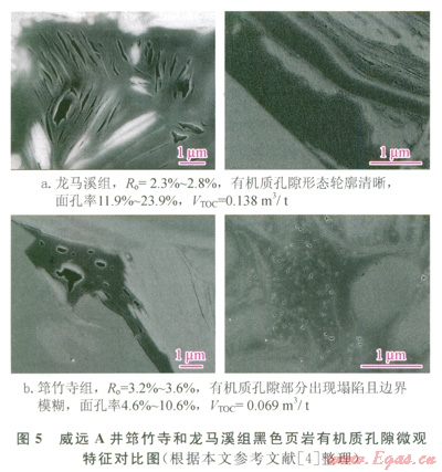 碳化不僅導(dǎo)致有機質(zhì)產(chǎn)氣能力降低,微觀結(jié)構(gòu)改變,導(dǎo)電性變強,而且對有機質(zhì)孔隙發(fā)育也會產(chǎn)生影響。鄒才能、董大忠、李新景等通過對威遠(yuǎn)地區(qū)筇竹寺組(R。介于3.2%~3.6%)和龍馬溪組(R。介于2.3%~2.8%)頁巖樣品開展高倍電鏡(氬離子拋光處理后)觀察發(fā)現(xiàn),在相近尺度(比例尺刻度值為1mm)的電鏡資料中,筇竹寺組頁巖有機質(zhì)孔隙發(fā)育程度較龍馬溪組頁巖差(圖5),主要表現(xiàn)為:受有機質(zhì)碳化影響,筇竹寺組有機質(zhì)孔隙出現(xiàn)明顯的塌陷和充填現(xiàn)象,邊界模糊不清或呈弧形,孔徑變小,其中大量直徑小于40nm的孔隙因完全充填而基本消失(圖5-b右),進(jìn)而導(dǎo)致有機質(zhì)內(nèi)微孔隙體積大幅度減少,測試面孔率僅4.6%~l0.6%(圖5-b);相反,龍馬溪組頁巖有機質(zhì)孔隙不僅數(shù)量多,且形態(tài)輪廓清晰(多呈菱形或多邊形),較少出現(xiàn)充填現(xiàn)象,測試面孔率為ll.9%~23.9%(圖5-a)。鏡下分析表明,受有機質(zhì)碳化影響,筇竹寺組頁巖有機質(zhì)產(chǎn)生的微孔隙體積明顯比龍馬溪組少,這與前面的計算結(jié)果(筇竹寺組的VTOC僅為龍馬溪組的1/2)相吻合。