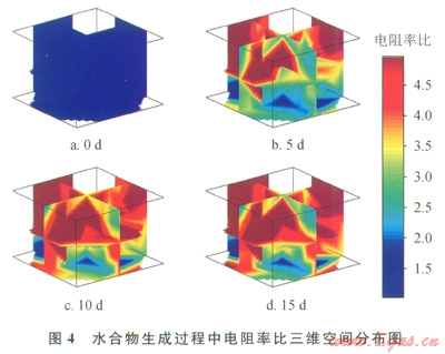 對比圖4a與圖4b發(fā)現(xiàn)電阻率變化量較大,而對比圖4c與圖4d發(fā)現(xiàn)電阻率變化較小。但是圖3中的壓力在整個水合物生成過程中是均勻下降的,表明水合物生成速率較穩(wěn)定,并沒有明顯的減慢趨勢。所以可以認為,電阻率與水合物飽和度并不是呈完全的線性關系。當水合物的飽和度升高到一定程度時,電阻率變化減緩。這是由于當多孔介質中生成一定飽和度的水合物時,水合物會將多孔介質中的通道阻塞,引起電阻率迅速上升;但當飽和度繼續(xù)上升時,電阻率則變化不大。