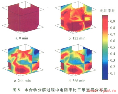 圖8是水合物分解過程中電阻率比三維空間分布圖。如圖8所示,圖8-a為開采前的水合物電阻率比三維分布圖,此時所有測點的電阻率比均為初始值l。圖8-b為開采第l22分鐘的電阻率比三維分布圖,此時水合物開采處于降壓開采階段,可以看見水合物藏內的水合物開始分解,并且分解主要集中于上層,這可能是由于開采井位于上層的原因。而圖8-c和圖8-d分別為第244分鐘和第366分鐘的電阻率比云圖,可發(fā)現(xiàn)水合物藏中的電阻率比持續(xù)下降,表明水合物持續(xù)分解。并且在第366分鐘(圖8-d)達到最低。