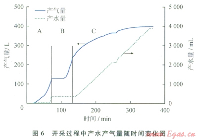 圖6為開采過程中產水、產氣量隨時間變化圖。如圖6所示,水合物開采過程一共歷時366min。3個開采階段的特性分別如下:自由氣釋放階段A中,逐漸產氣約ll5L,并在產氣即將結束的時候開始產水,共產水約400mL,此階段中的產氣和產水都是原先貯存于水合物藏中的自由氣和自由水;降壓開采階段B中,首先靜置了約30min后,再進行降壓分解實驗,在降壓過程中共產氣約120L,但是沒有更多的水產出;注熱開采階段C中,共產氣約l50L,產氣速率隨著開采過程的進行而降低,最終降低至0。這是由于水合物藏中的水合物逐漸分解完,水合物分解量減小從而導致產氣速率降低。并且在整個水合物注熱開采過程中,產水速率基本保持不變(約為20mL/min),基本與注水速率保持一致。