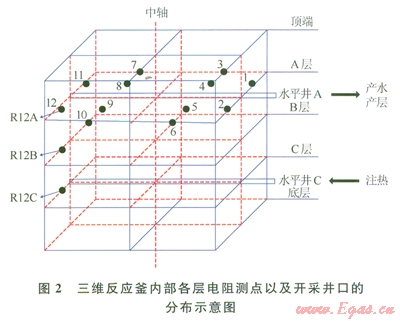 圖2繪出了三維反應釜內部各層電阻率測點以及開采井口的分布示意圖。從圖2中可以看出,共有l2×3個電阻測點以及分別位于A、C兩層的中心水平井。本實驗中,反應釜注熱井為底層水平C井,出口為與注熱井在同一垂直截面上的頂層水平A井。實驗中,壓力由Trafag制造的NAT8251.7425型壓力傳感器測量,測量范圍為0~25MPa,精度為±0.02MPa。溫度由Ptl00鉑電阻測量,測量范圍為-20~200℃,精度為±0.1℃。蒸餾水由平流泵注入,通過中間容器,經過加熱罐后被加熱為高溫蒸汽進入釜內。平流泵為北京創(chuàng)新通恒有限公司制造的P3000型,流量范圍為0~50mL/min,精度為±0.001mL/min,壓力范圍為0~25MPa。加熱罐由南通飛宇有限公司制造,可加熱水至30~190℃,精度為±0.1℃。供氣部分包括甲烷氣瓶、壓力調節(jié)閥、穩(wěn)壓器、氣體流量計等,氣體流量計采用北京七星D07型質量流量控制器,量程為0~10L/min,測量精度為l%。’實驗所用氣體為99.9%的純甲烷氣體,由佛山華特氣體有限公司提供。