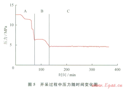 圖5為開采過程中系統(tǒng)壓力隨時間變化圖。如圖5所示,根據(jù)壓力的變化可以把整個開采階段分為3個階段,分別為階段A、階段B和階段C。其中,在階段A中,壓力由生成結束時的12MPa降低至6.5MPa,而6.5MPa高于此時水合物藏溫度8℃所對應的相平衡壓力(5.6MPa),也就是說在階段A中水合物并不分解,所以此階段被稱為自由氣釋放階段。在階段8中,壓力由6.5MPa降低至4.7MPa,在此階段中,由于系統(tǒng)壓力低于相平衡壓力導致水合物開始分解,所以此階段被稱為降壓開采階段。在階段C中,壓力穩(wěn)定在4.7 MPa附近幾乎不變,并且開始通過水平井C注熱開采水合物,所以此階段被稱為注熱開采階段。