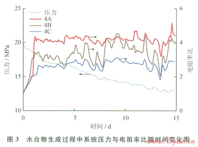 在本項研究中,甲烷水合物生成過程歷時約15天,在此過程中反應釜系統(tǒng)壓力由20MPa下降至12MPa。由于本工作所用電極對的電阻探頭在反應釜中間距不一致,在這里,筆者同樣利用實驗過程中實時的電阻率值與實驗開始前的電阻率的比值作為比較的參數(shù)。圖3是在水合物生成過程中系統(tǒng)壓力與電阻率比隨時間變化圖。圖3中以4A、4B和4C作為參考點,研究生成過程中A、B、C 3層的電阻率變化區(qū)別。如圖3所示,在甲烷水合物生成的第一和第二天電阻率值同時快速升高,表明在位于4A、4B、4C處的水合物迅速生成。然而在水合物生成的余下約l3天的時間中,系統(tǒng)壓力持續(xù)下降,表明反應釜中的水合物在持續(xù)生成,但是電阻率并沒有明顯上升趨勢。這有可能是由于位于4A、4B、4C測點處水合物在前兩天的牛成中已經達到飽和狀態(tài),電阻率無法再升高,而水合物在其他地區(qū)繼續(xù)生成。說明水合物在反應釜內各點的生成并不是同步的。
